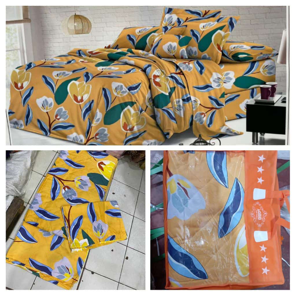 Ensemble couverture lourde + 2 draps de lits motif fleuri jaune