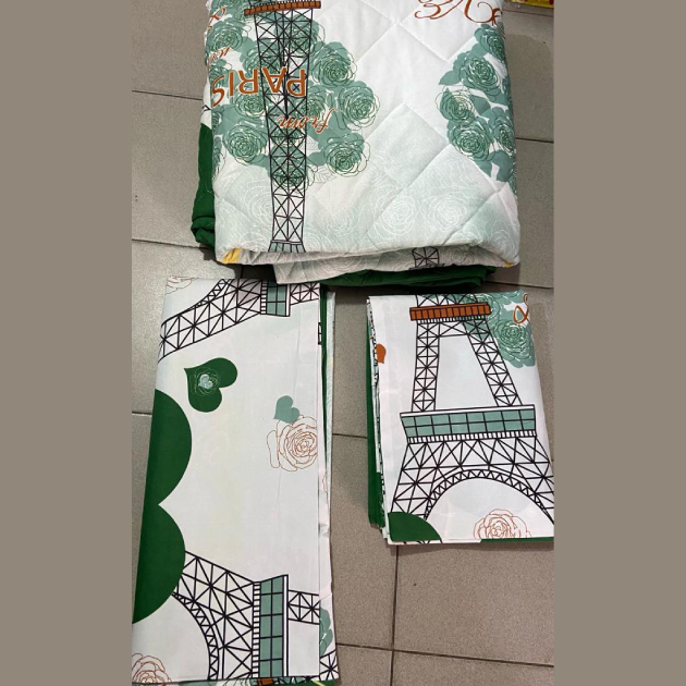 Ensemble couverture lourde + 2 draps de lits motif Tour-Eiffel Paris vert/blanc