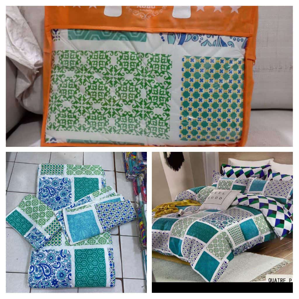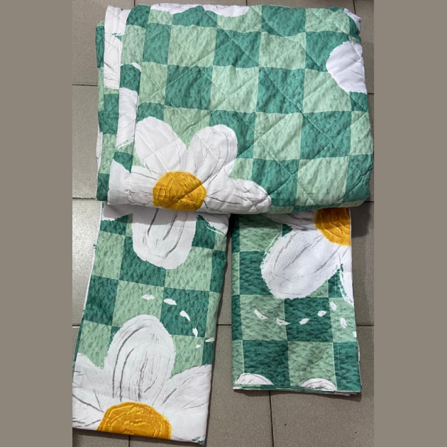 Ensemble couverture lourde + 2 draps de lits motif carré fleuri vert/jaune/blanc