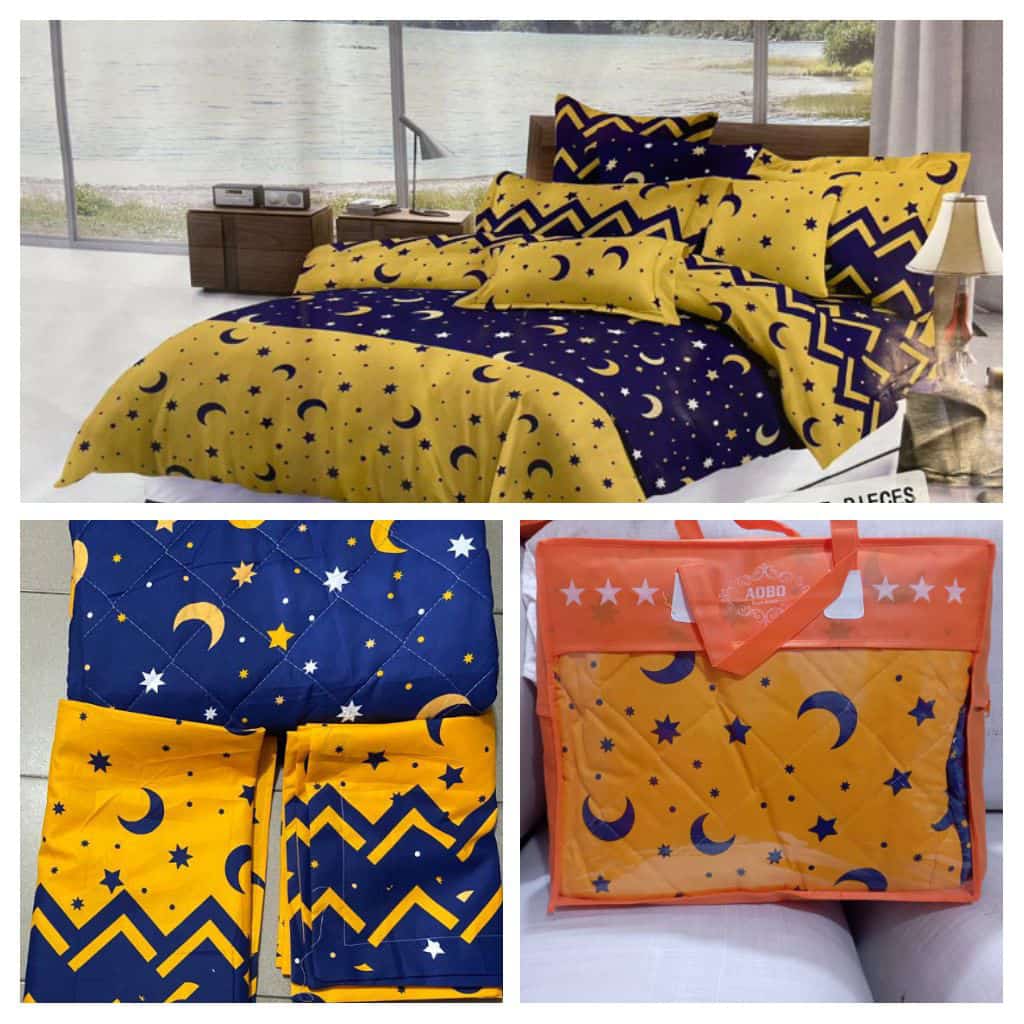 Ensemble couverture lourde + 2 draps de lits motif lune étoile jaune/bleu